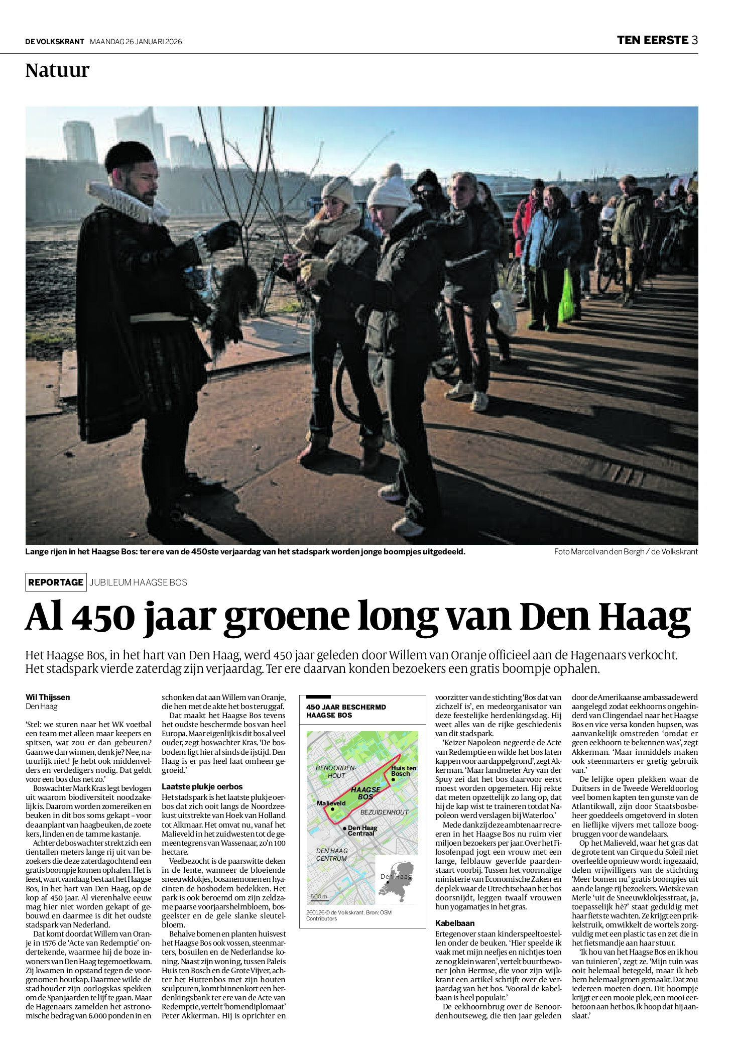Het Haagse Bos, in het hart van Den Haag, werd 450 jaar geleden door Willem van Oranje officieel aan de Hagenaars verkocht. In deze Akte van Redemptie stond een belangrijke belofte: in het Haagse Bos, de Koekamp en op het Malieveld mag door niemand bomen worden gekapt voor de verkoop van hout. Ook mag Staatsbosbeheer, als eigenaar, het gebied niet verkopen, anders vervalt deze belofte. Dit jaar viert het stadspark zijn 450-jarig bestaan; een ideaal moment om boompjes uit te delen dus! Dat deed het Haagse team van Meer Bomen Nu afgelopen zaterdag 24 januari 2025, in samenwerking met de gemeente Den Haag, Staatsbosbeheer en Stichting Het bos wat van zichzelf is.