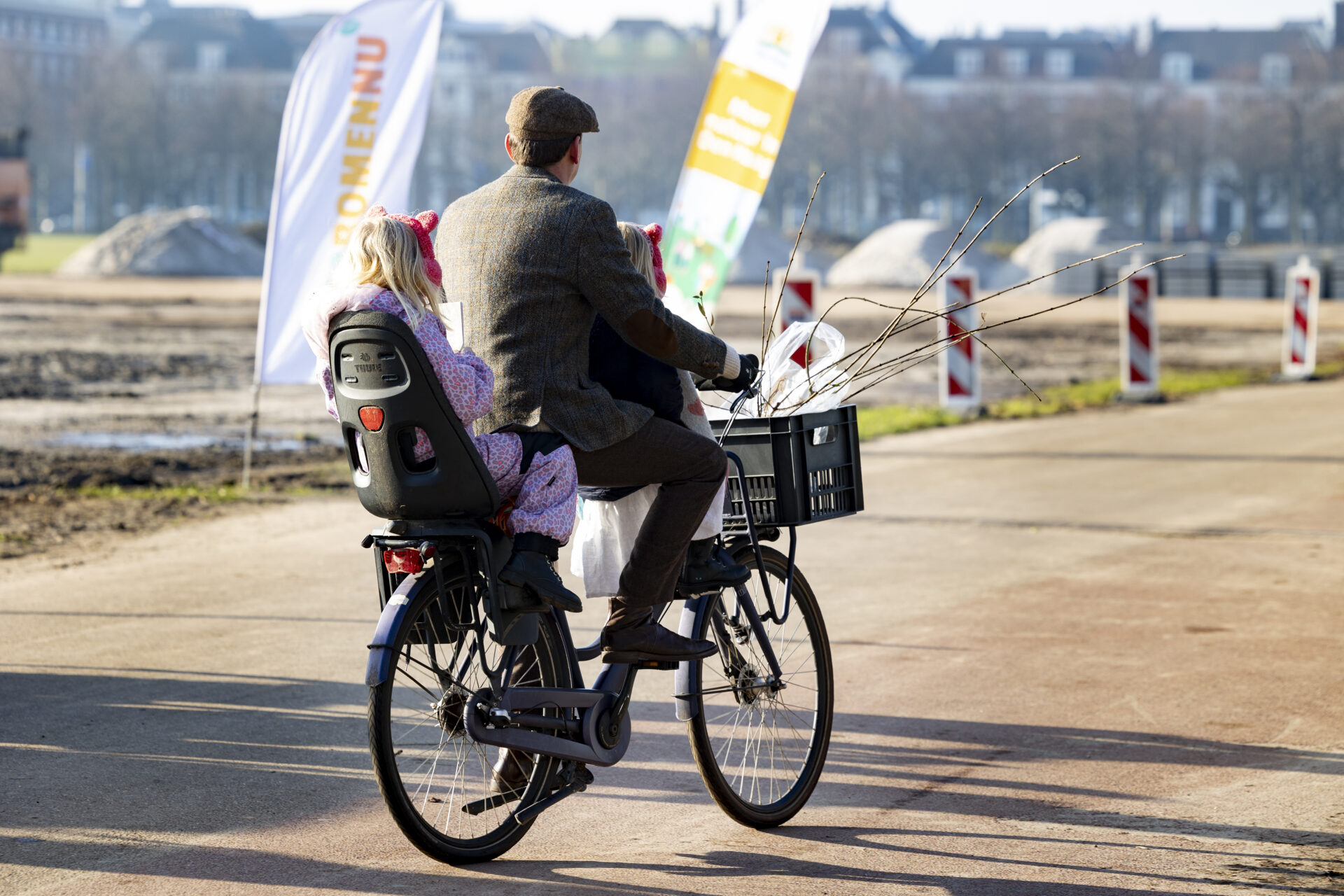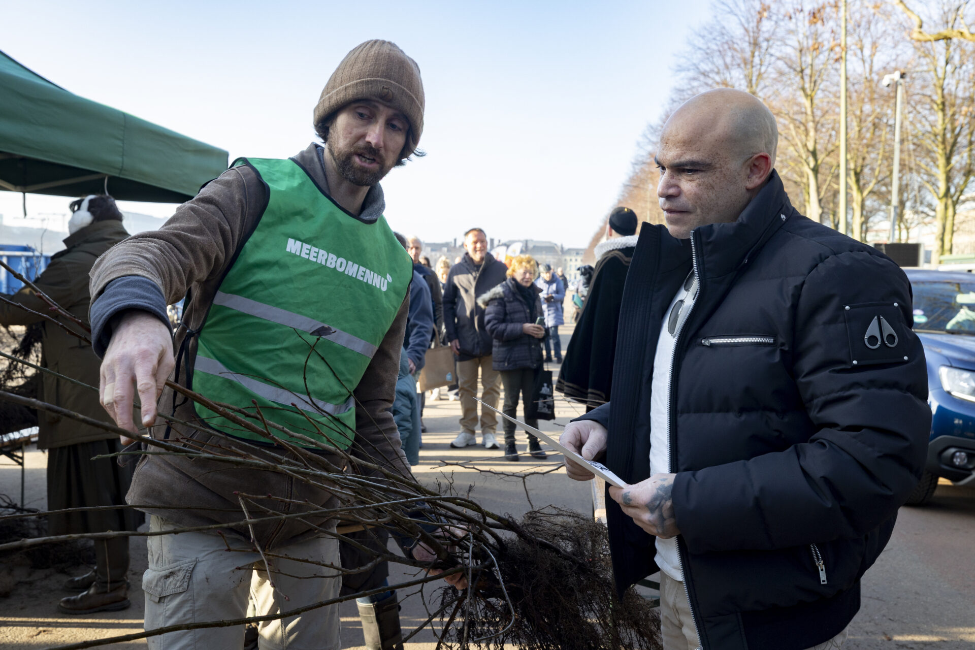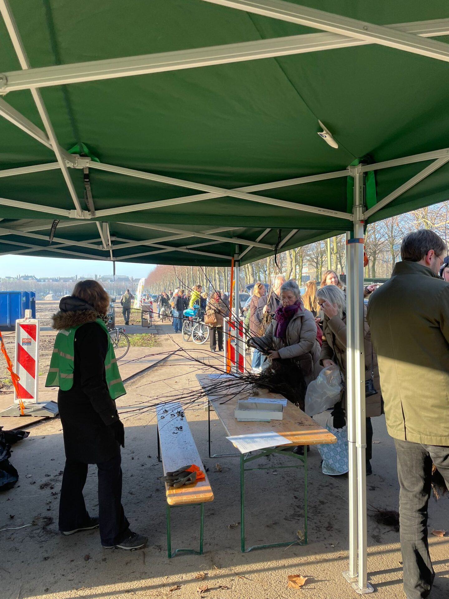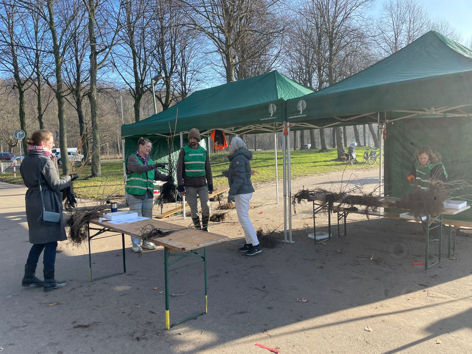 Het eerste uur was het een drukte van jewelste. De rij auto’s reikte tot aan de Koningskade, maar ook voetgangers en fietsers waren goed vertegenwoordigd. Het Meer Bomen Nu-team draaide op volle toeren: Jacintha en Iris renden op en neer om bundeltjes te maken, Bart gaf uitleg over de soorten die mensen meekregen. Samen met de collega’s van Staatsbosbeheer en de gemeente vormden we een geoliede machine.