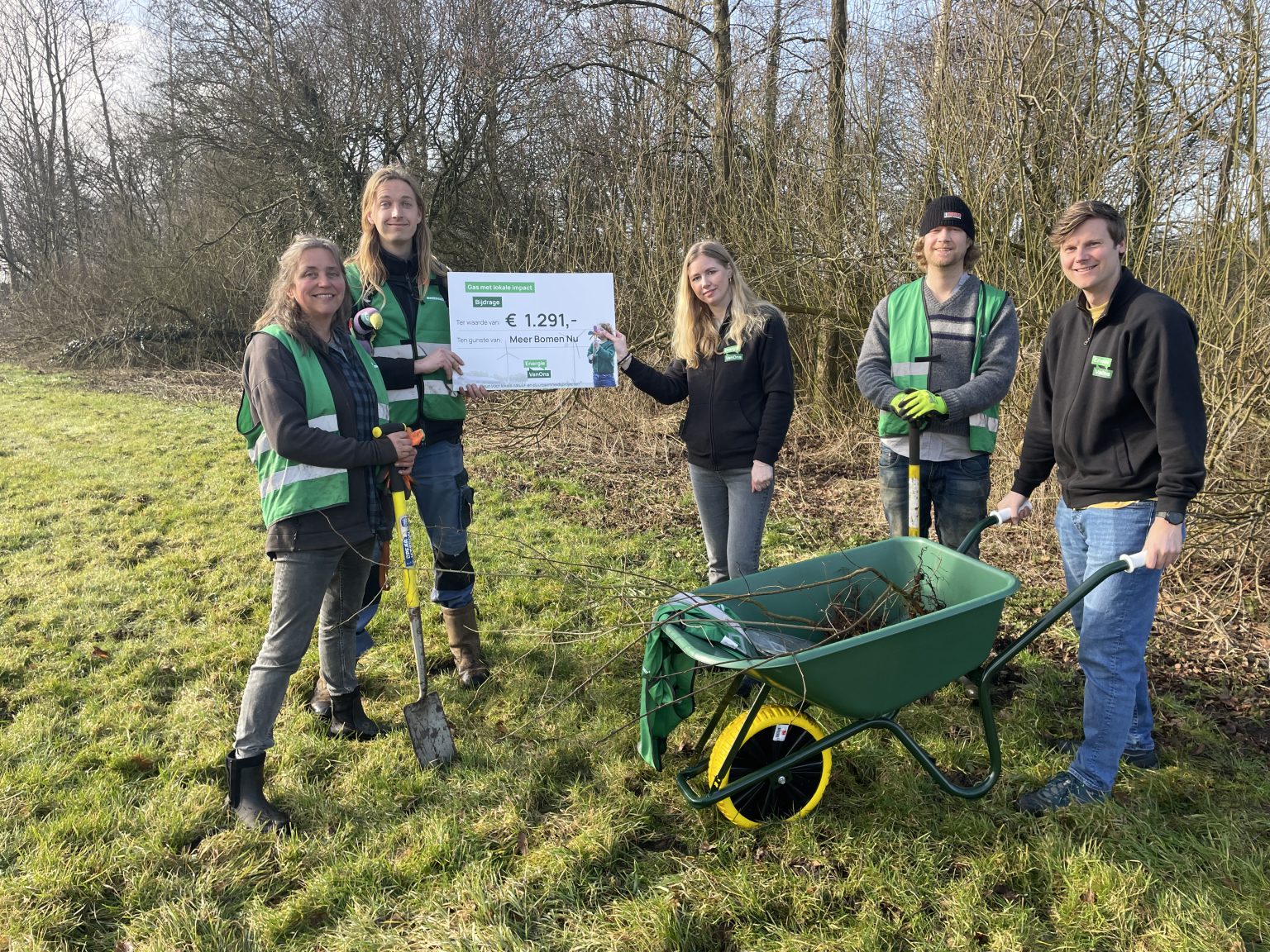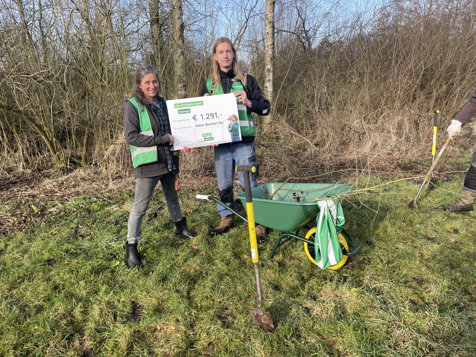 @meerbomen.nu ontving via Energie VanOns een vergoeding van €1.291. Daarmee investeerden ze o.a. in nieuwe kruiwagens. Klinkt simpel (en dat is het ook), maar juist dit soort stevige, praktische materialen maken vrijwilligerswerk een stuk makkelijker: boompjes, scheppen, zand en plantmateriaal moeten tijdens oogst- en plantdagen continu van A naar B.