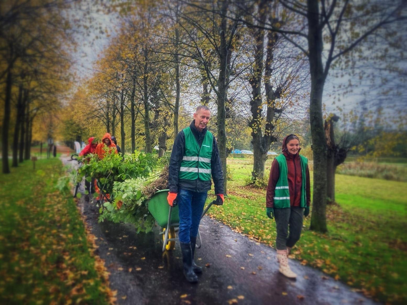 Helaas begon het na zo’n twee uur stevig doorwerken, ook stevig te regenen. Marcel, één van de vrijwilligers, had zich goed voorbereid en haalde zijn knaloranje regen-onesie tevoorschijn (zie foto!). De voorspelling voor de komende uren zag er echter niet goed uit en in samenspraak hebben we besloten alle oogst te verzamelen en terug te gaan naar het borgterrein van Op Ewsum.