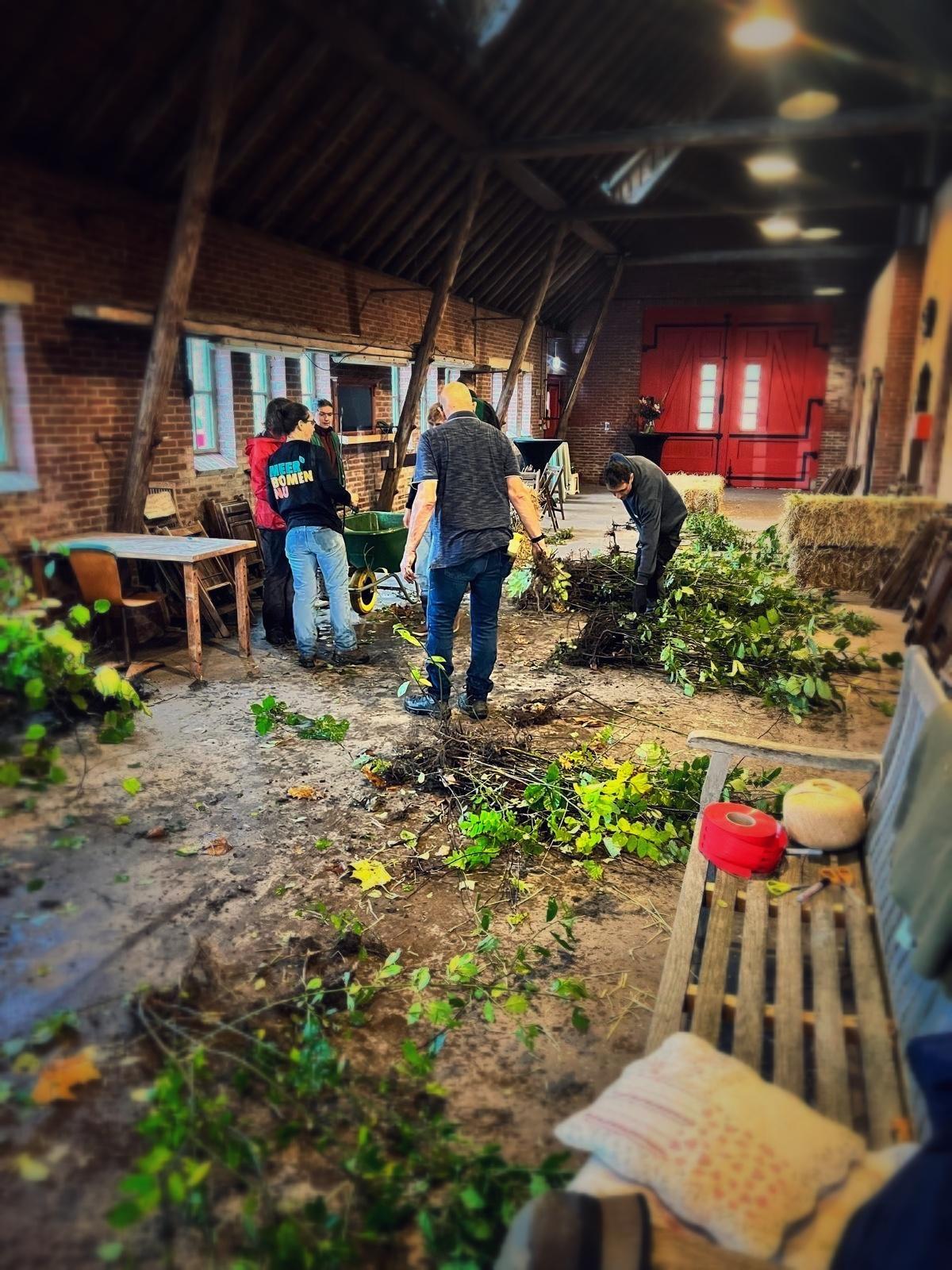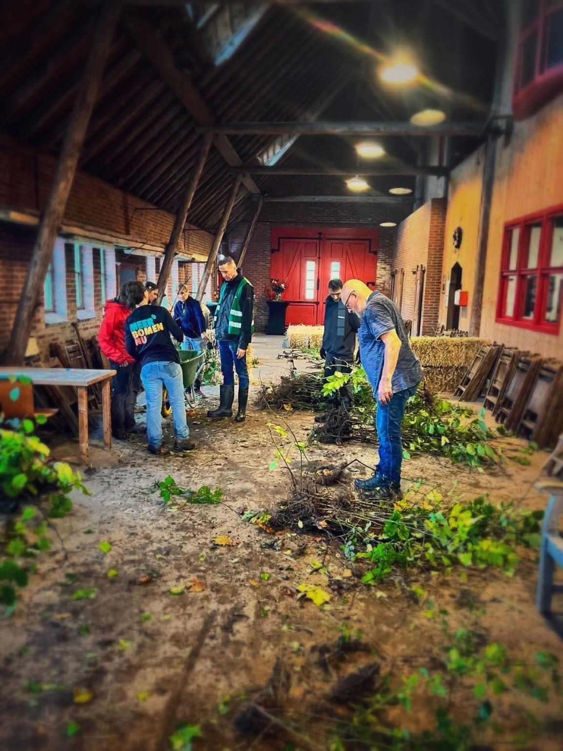 Daar konden we in de droge schuur de geoogste boompjes en struikachtigen sorteren, bundelen, labelen en tellen. Aan het begin van het seizoen is de routine en kennis wat weggezakt. Hoe herken je ook alweer een Es en hoe zie je het verschil tussen een Veldesdoorn en een Meidoorn? Wat is een goede hoeveelheid voor een bundel zaailingen die niet te groot, niet te klein en goed in te kuilen is? Wie knipt de touwtjes en schrijft de labels? Vele handen maken hierbij licht werk!