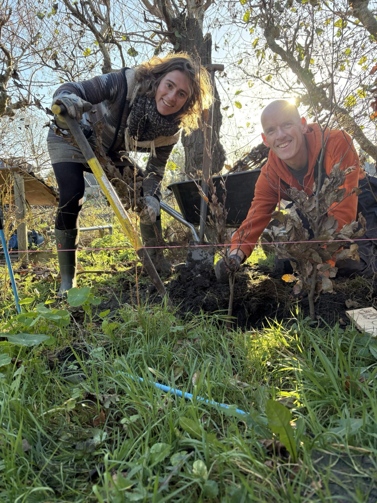 Voor hun terrein is een professioneel ontwerp gemaakt, en tijdens deze Plantdag werden de eerste contouren van dat plan zichtbaar. Er werd gewerkt aan een windsingel: een beschermende strook van bomen en struiken rondom het erf. Vol enthousiasme en met veel modderige schoenen plantten de co-coördinatoren onder andere Beuken, Esdoorns, en Essen, afgewisseld met struiken als Hazelaar en Meidoorn. Ook werd een beukenhaagje aangelegd als erfafscheiding.