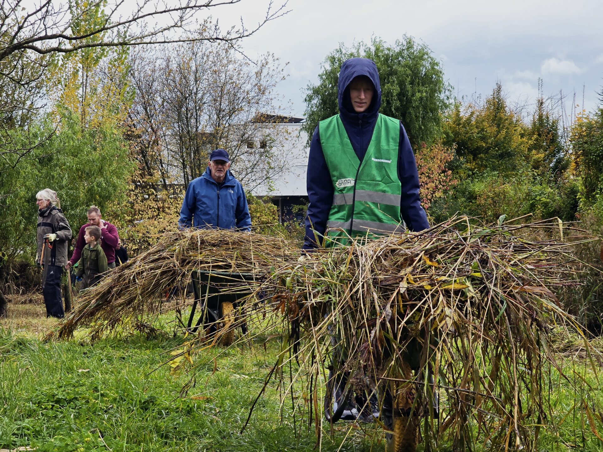 We hadden van te voren afgesproken dat we de dag ‘organisch’ zouden laten verlopen. Dus na een compleet verzorgde lunch met verwarmende soep gingen we gezamenlijk helpen bij de natuurwerkzaamheden op Hogerzael. Daar zou een broeihoop komen van het gemaaide riet. Zwaar werk... Met riek en hark het riet verzamelen, op de kruiwagen en naar de broeihoop. We kregen al snel de vaart erin en dankzij de gekozen aanpak was het na 2 uur allemaal verzameld en verwerkt. Langzaam begon de zon door te breken en hebben we de oogst geteld en gebundeld en gelijk ingeladen. Een nieuwe vrijwilliger kon deze zaailingen goed gebruiken voor zijn nieuwe voedselbos en heeft alles meegenomen aan het eind van de middag.