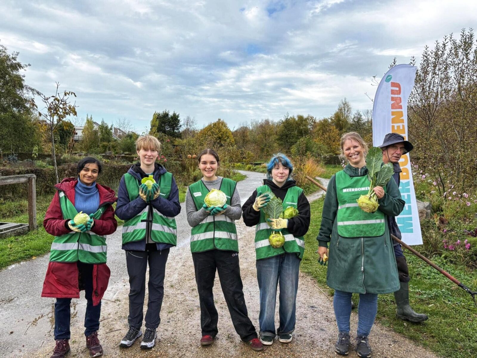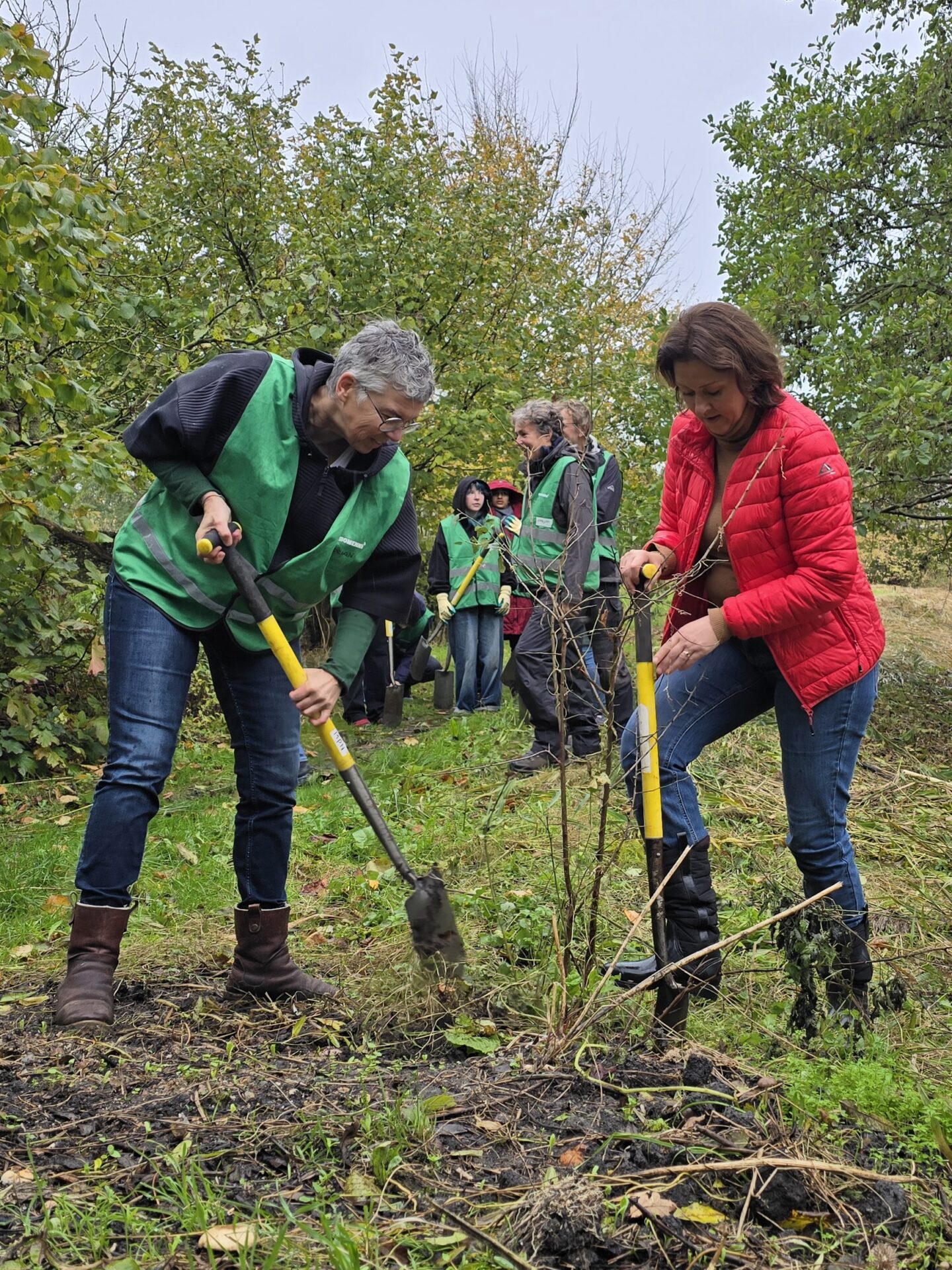 We waren met 35 mensen in totaal; een deel van de vrijwilligers van Hoogerzael, aangevuld met zo'n 15 Meer Bomen Nu vrijwilligers. Deze bestond uit vaste vrijwilligers, maar ook veel nieuwe gezichten! Waaronder studenten van de Hogeschool Zeeland [HZ] en natuurlijk Anita Pijpelink (oud gedeputeerde) die de openingshandeling zou verrichten. Ook de pers was aanwezig dus toen het even iets minder regende zijn we de ‘eerste zaailing' gaan oogsten; een fotomoment met een sleedoorn en de officiële start van het seizoen en deze Oogstdag.